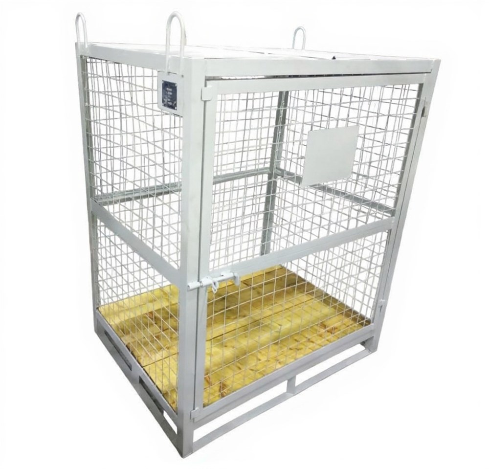 Клеть для газовых баллонов ф305 мм КСБ-09ПД предназначена для хранения, транспортировки, погрузки и разгрузки баллонов с пропаном. Конструкция клети КСБ-09ПД позволяет производить подъем краном, кран-балкой, вилочным погрузчиком, гидравлической тележкой. Для предотвращения шума и ударов баллонов при транспортировке рекомендуется использовать резиновые уплотнительные кольца, которые надеваются непосредственно на баллоны. Сварной каркас из металлического уголка и металлической сетки. Клеть имеет крышу для защиты баллонов от осадков, дно контейнера выполнено из дерева толщиной 40 мм.