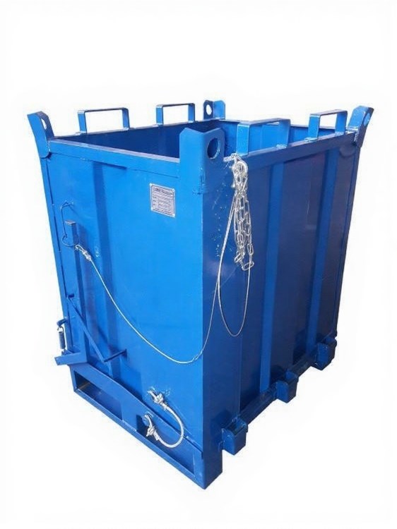 Контейнер с откидным дном предназначен для накопления и перемещения твердых сыпучих грузов. Конструкция контейнера обеспечивает возможность подъема контейнера грузоподъемной техникой (погрузчиком, краном) для перемещения и выгрузки груза. Для подъема контейнера рогами погрузчика для выгрузки в верхней части контейнера расположены зацепы 200х80 мм. Для подъема контейнера краном в верхней части контейнера по углам расположены зацепы. Открытие дна контейнера производится дистанционно при помощи тросовой тяги. Открытие дна одностороннее. На платформу возможно установить четыре большегрузных колеса для ручной транспортировки до места установки.