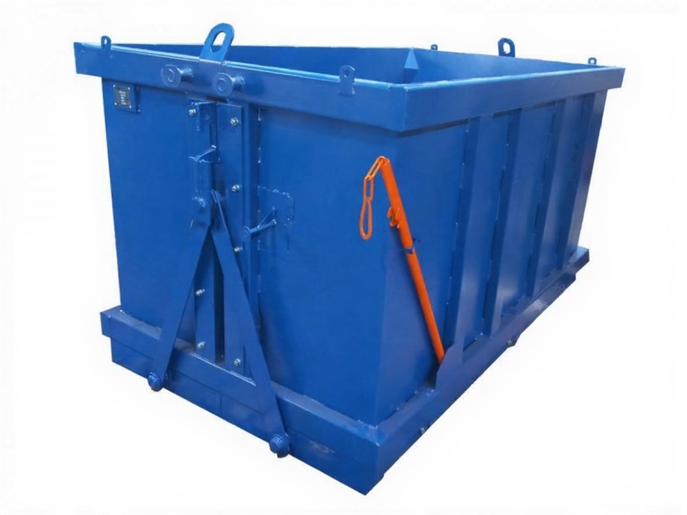 Контейнер с двойным откидным дном предназначен для накопления и перемещения твердых сыпучих грузов. Конструкция контейнера обеспечивает возможность подъема контейнера краном для перемещения и выгрузки груза. Открытие дна контейнера производится путем зацепления строп с нижних на верхние кронштейны контейнера.