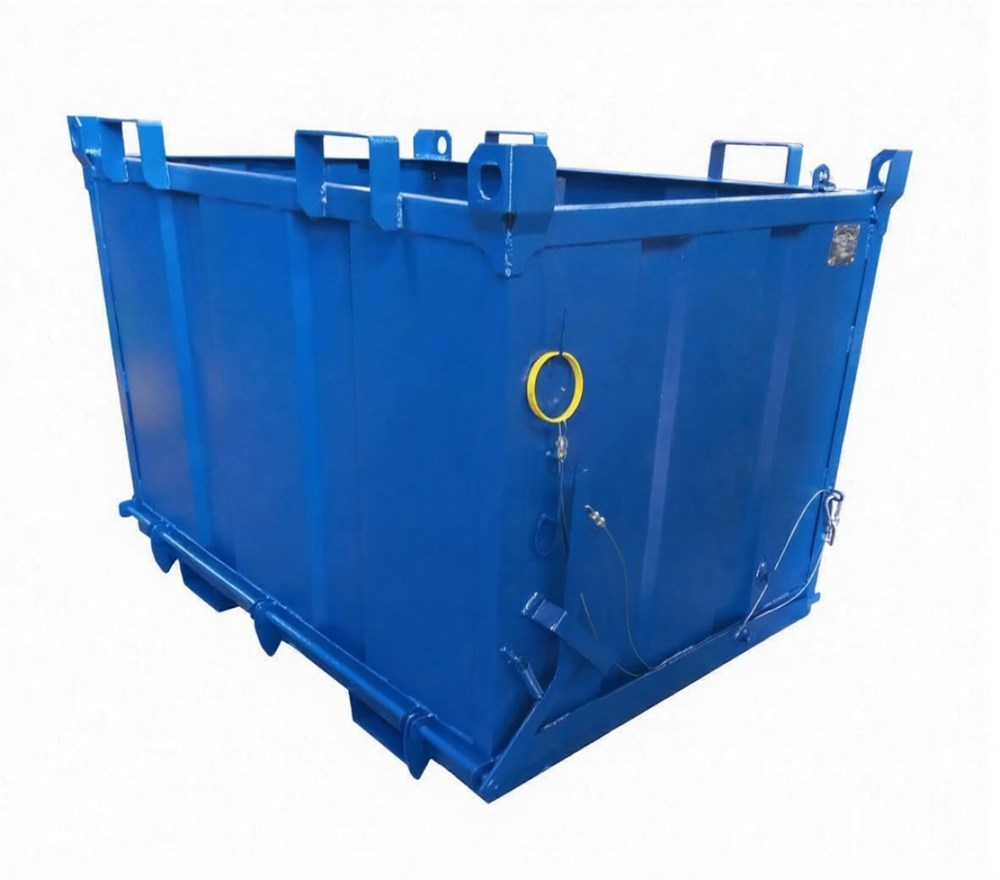 Контейнер металлический с откидным дном 1,5 м3 предназначен для накопления и перемещения твердых сыпучих грузов. Конструкция контейнера обеспечивает возможность подъема контейнера грузоподъемной техникой (погрузчиком, краном) для перемещения и выгрузки груза. Открытие дна контейнера производится дистанционно при помощи троса. Открытие дна одностороннее. На платформу возможно установить четыре большегрузных колеса для ручной транспортировки до места установки.