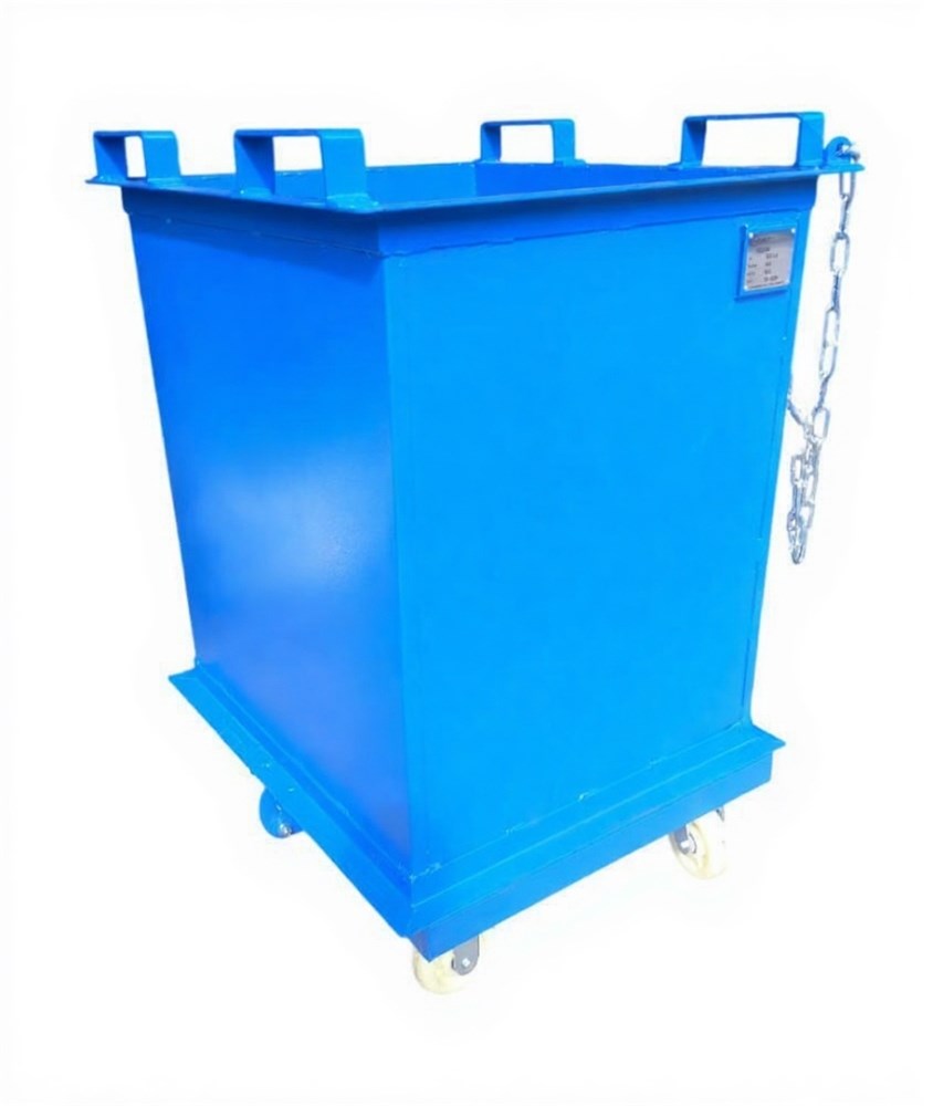 Контейнер с откидным дном предназначен для накопления и перемещения твердых сыпучих грузов. Конструкция контейнера обеспечивает возможность подъема контейнера грузоподъемной техникой (погрузчиком) для перемещения и выгрузки груза. Для подъема и выгрузки контейнера погрузчиком в верхней части контейнера расположены зацепы размером 200х80 мм. Открытие дна контейнера производится автоматически при нажатии дном контейнера о борт принимающего бункера. Открытие дна одностороннее. На платформу устанавливаются четыре колесные опоры для ручной транспортировки до места установки.