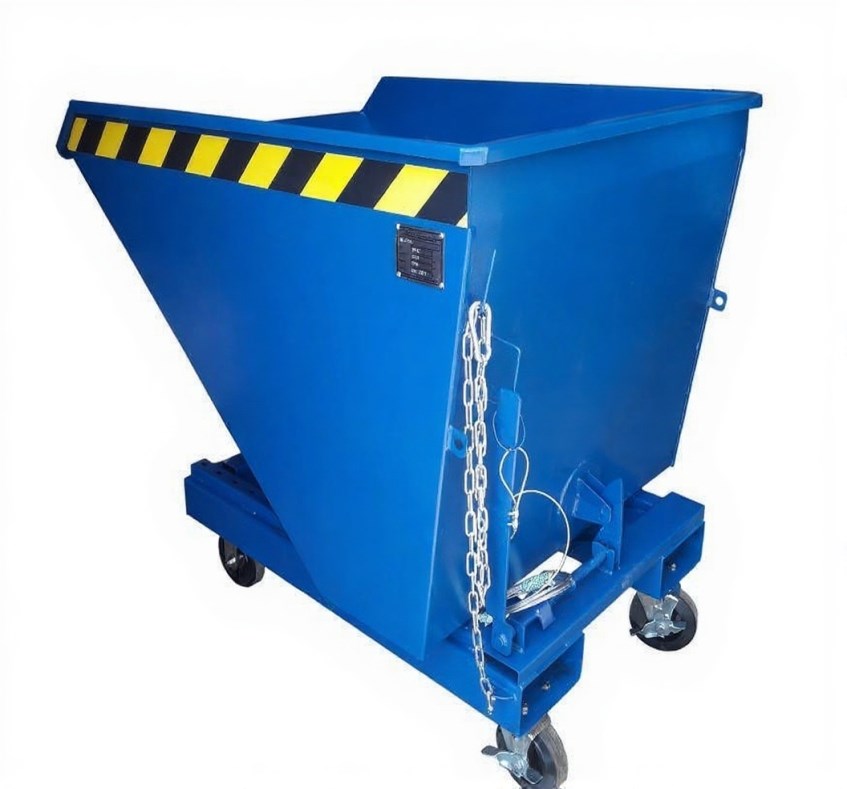 Контейнер "К-550" самоопрокидывающийся предназначен для накопления и перемещения твердых веществ и материалов. Контейнер может комплектоваться мобильной платформой. На платформу устанавливаются четыре колесные опоры в зависимости от нагрузки на контейнер. Конструкция платформы контейнера имеет карманы 200х80 мм для возможности подъема контейнера грузоподъемной техникой. Установлена блокировка против непреднамеренного соскальзывания и опрокидывания контейнера. Выгрузка контейнера производится оператором в ручную нажатием на рычаг либо не посредственно из кабины автопогрузчика при помощи троса. При дополнительной комплектации контейнера двойным дном и сливным краном возможно использование контейнера для накопления металлической стружки.