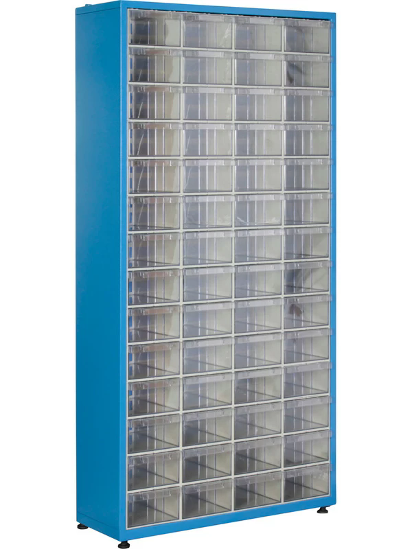 Шкаф TMD 501 от компании Дигрус — это эффективный и эргономичный инструмент для грамотного хранения множества мелких предметов, инструментов и комплектующих. Эта модель предлагает большое количество ящиков (всего 56 штук), расположенных в едином корпусе размером 900х310х1900 мм.