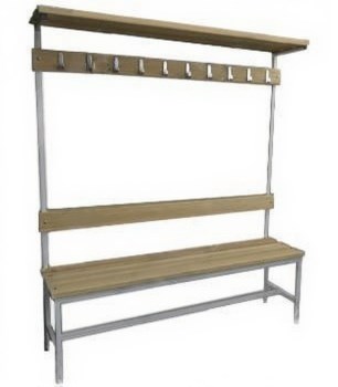 Сидение, спинка, вешалка и полка для головных уборов скамьи изготовлены из дерева, массивные доски древесина лиственных или хвойных пород толщиной 28 мм покрытые водостойким лаком в два слоя, крепление к каркасу при помощи мебельных болтов. Количество крючков зависит от длины скамьи (при длине 1500 мм - 10 крючков). Каркас скамьи и вешалки – из крепкого стального прямоугольного профиля 25 х 25 мм. Полимерное декоративное покрытие, особо прочное, защищает от коррозии, устойчиво к перепадам температуры.