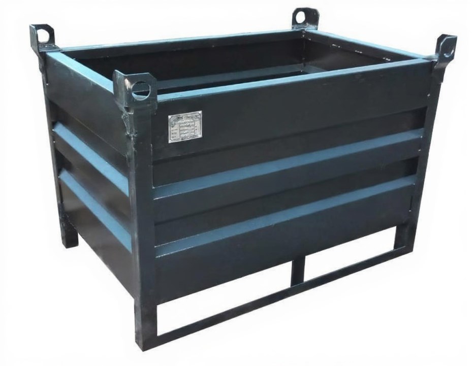 Тара металлическая производственная (размеры габаритные 840х1240х730 мм) - цельносварная металлическая конструкция с усиленными ребрами жесткости бортами и дном. Тара металлическая предназначена для хранения груза в штабеле и грузовых стеллажах, перемещения груза между операциями внутри цеха, между производственными цехами или до конечного получателя. Тара с грузом перемещается погрузчиком (захват рогами погрузчика с длинной стороны тары для лучшей фиксации от опрокидывания), штабелером, гидравлической тележкой или подъемным краном ( подъем за четыре кронштейна расположенных по углам в верхней части тары, угол между строп не должен превышать 90 градусов). Тара штабелируется друг на друга, что позволяет значительно сократить площадь хранения на складе и хранить без применения грузовых стеллажей, так же снизить транспортные расходы при транспортировке. Окрашена металлическая тара полимерной порошковой краской (Синий RAL 5005). Возможен окрас в цвет по желанию заказчика, а так же нанесение дополнительных надписей. На борт тары закреплен шильдик с информацией от производителя о таре. На каждое изделие (тару) выдаётся паспорт.