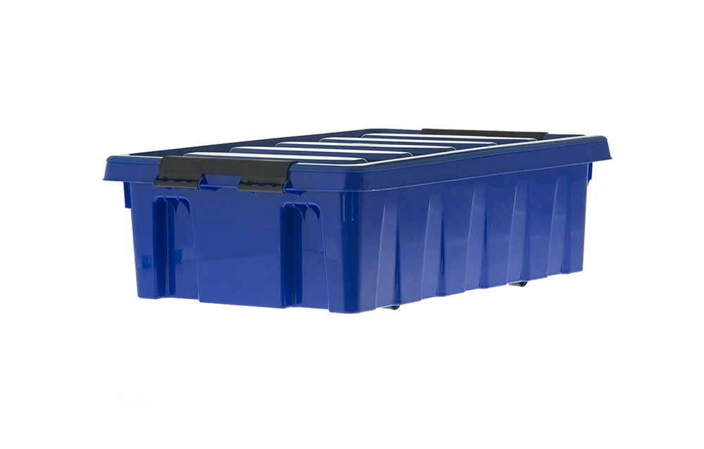 Модель сочетает в себе компактные размеры, большую вместимость и повышенную мобильность. Конусная форма и возможность вкладывания упрощают хранение пустых ящиков. Ящик поставляется в двух цветах: прозрачный и синий.