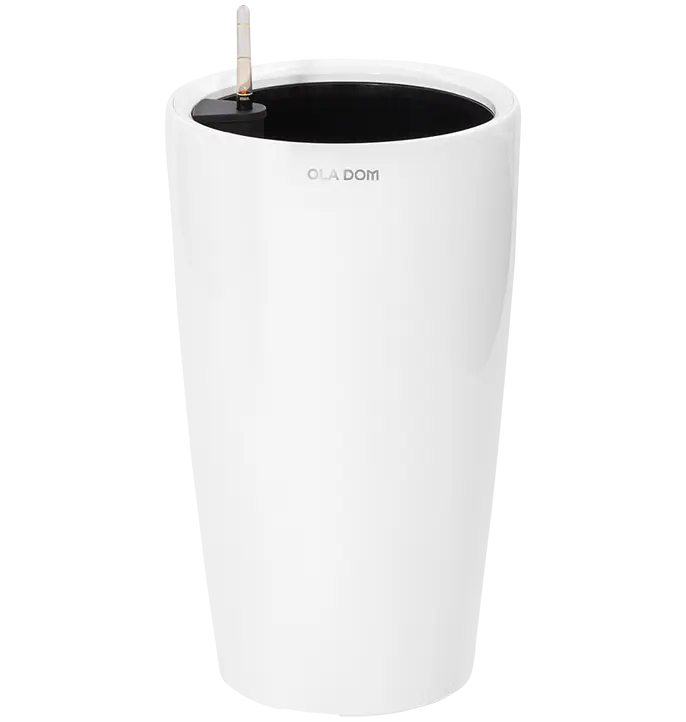 Корпус выполнен из стеклонаполнённого полипропилена — материала, устойчивого к ультрафиолету, влаге и резким перепадам температуры. Он не трескается при замерзании, не выцветает на солнце и хорошо сохраняет форму при длительном использовании на открытом воздухе. Глянцевая белая поверхность придаёт кашпо аккуратный вид и легко очищается от загрязнений — достаточно влажной салфетки или мягкой ткани.