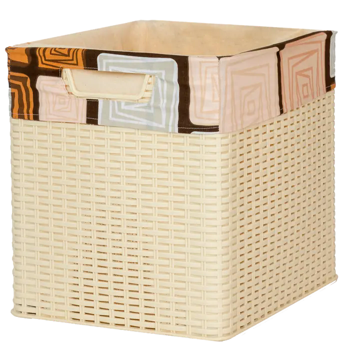 Вместительная корзина средних габаритов для хранения личных вещей, документов, одежды и других аксессуаров. Масса изделия — всего 1,5 кг, поэтому корзина легка для переноски. Удобные ручки по краям изделия еще больше упрощают использование и транспортировку. Противоскользящие ворсовые вставки на дне предотвращают скольжение и не царапают мебель. Корзина отличается оригинальным дизайном, имитирующим плетение, и легко встроится в любой интерьер. Высококачественный пластик устойчив к любым нагрузкам и внешним воздействиям. С данным вариантом идет в комплекте тканевый мешок.