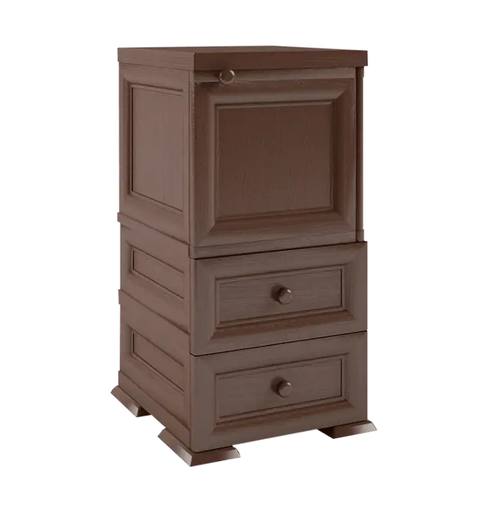 Стильный классический малогабаритный шкаф с одним большим просторным отделением сверху и двумя выдвижными ящиками снизу. Благодаря сдержанному лаконичному дизайну это недорогое и практичное изделие будет красиво смотреться в углу прихожей, коридора или небольшой загородной комнаты. Поверхность шкафа — имитация дерева. Небольшой вес обеспечивает изделию мобильность: выполнить перестановку шкафа при необходимости сможет даже один человек. Шкаф устойчив к повышенной влажности и температурным перепадам, невосприимчиво к большим нагрузкам. Высококачественные материалы, использованные при фабричной сборке, обеспечивают изделию долговечность. Цвет шкафа не портится при уборке обычными бытовыми химическими средствами. Прочно удерживается на любой поверхности. Изделие доступно в трех цветовых вариантах: в бежевом и древесном цветах, а также в цвете темного шоколада.