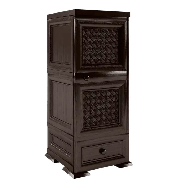 Небольшой удобный шкаф с двумя просторными отделениями на створчатой распашной дверце и с выдвижным ящиком снизу. Невысокий и компактный, он замечательно встанет в угол прихожей, коридора или спальни. В большие отделения удобно положить белье или одежду, а в выдвижной ящик — украшения, аксессуары и личные принадлежности. Поверхность изделия — имитация дерева. Дверцы и фронтальная поверхность выдвижного ящика украшены дизайнерским узором. Небольшой вес обеспечивает изделию дополнительную мобильность: шкаф при необходимости можно взять с собой на дачу или легко перевезти из одной квартиры в другую.