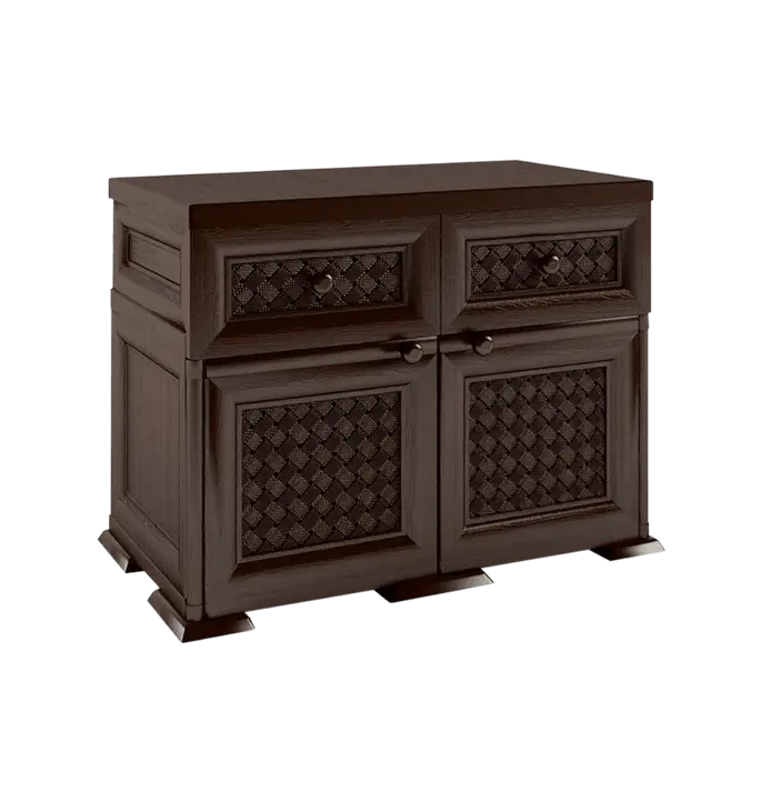 Компактный и очень стильный комод с двумя большими отделениями и двумя выдвижными ящиками. Отлично подойдет для тех, кому нужно решить вопрос хранения одежды и личных вещей. Поверхность изделия имитирует натуральное дерево, дверцы украшены красивым дизайнерским узором. Благодаря искусному и привлекательному дизайну комод впишется в любой интерьер, от коридора и прихожей квартиры до офиса или веранды загородного дома. Небольшой вес — всего 11,4 кг — позволяет легко перенести изделие вдвоем без лишних усилий.